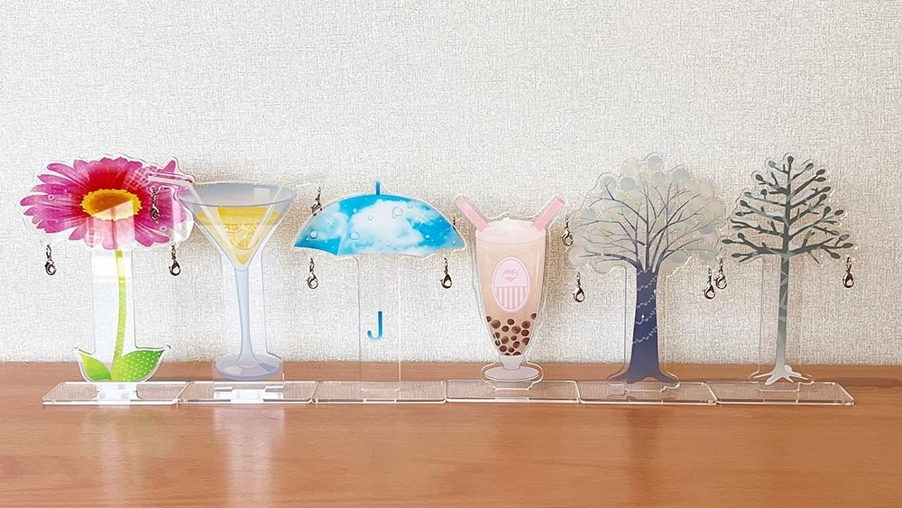 また、高さはおよそ15cmと一般的なアクリルスタンドと同じサイズなので、カニカンを外し、お手持ちのアクリルスタンドと並べて飾ったり、写真を撮る際の背景として使用することも。