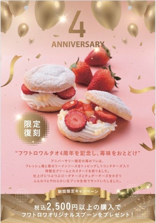 小樽洋菓子舗ルタオと阪急百貨店のコラボで誕生したスイーツブランド、フワトロワルタオは、2022年6月20日(月)で4周年を迎えます。そこで、店内にある工房で毎日一つ一つ手作りで生産している生ブッセ「ブーシェフレ」から「ブーシェフレ・アニバーサリーフレーズ」を6月20日(月)から6月30日 (木)まで期間限定で販売いたします。