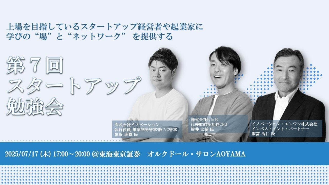 2025年7月17日(木)に、第7回スタートアップ勉強会を開催します。本ファンドGPのイノベーション・エンジン株式会社とLPの株式会社イノベーションにて共催し、ゲストに2024年3月に上場を果たした株式会社L is B代表取締役社長CEOの横井 太輔 氏をお招きいたします。