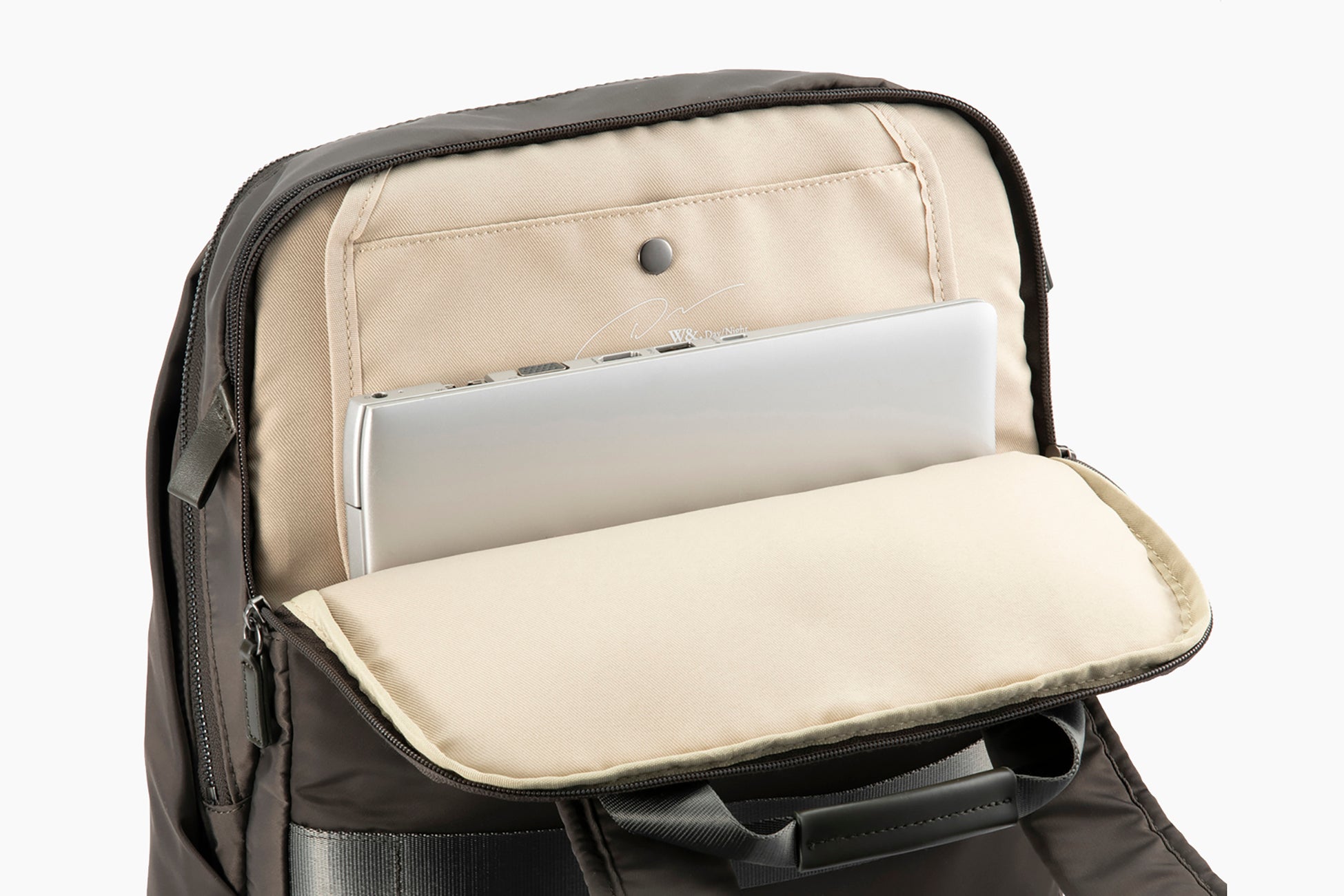 PC収納部は端子部分を覆う雨除けフラップ付き。フラップのポケットにはUSBメモリやモバイルWi-Fiなど周辺アクセサリを収納できます。
