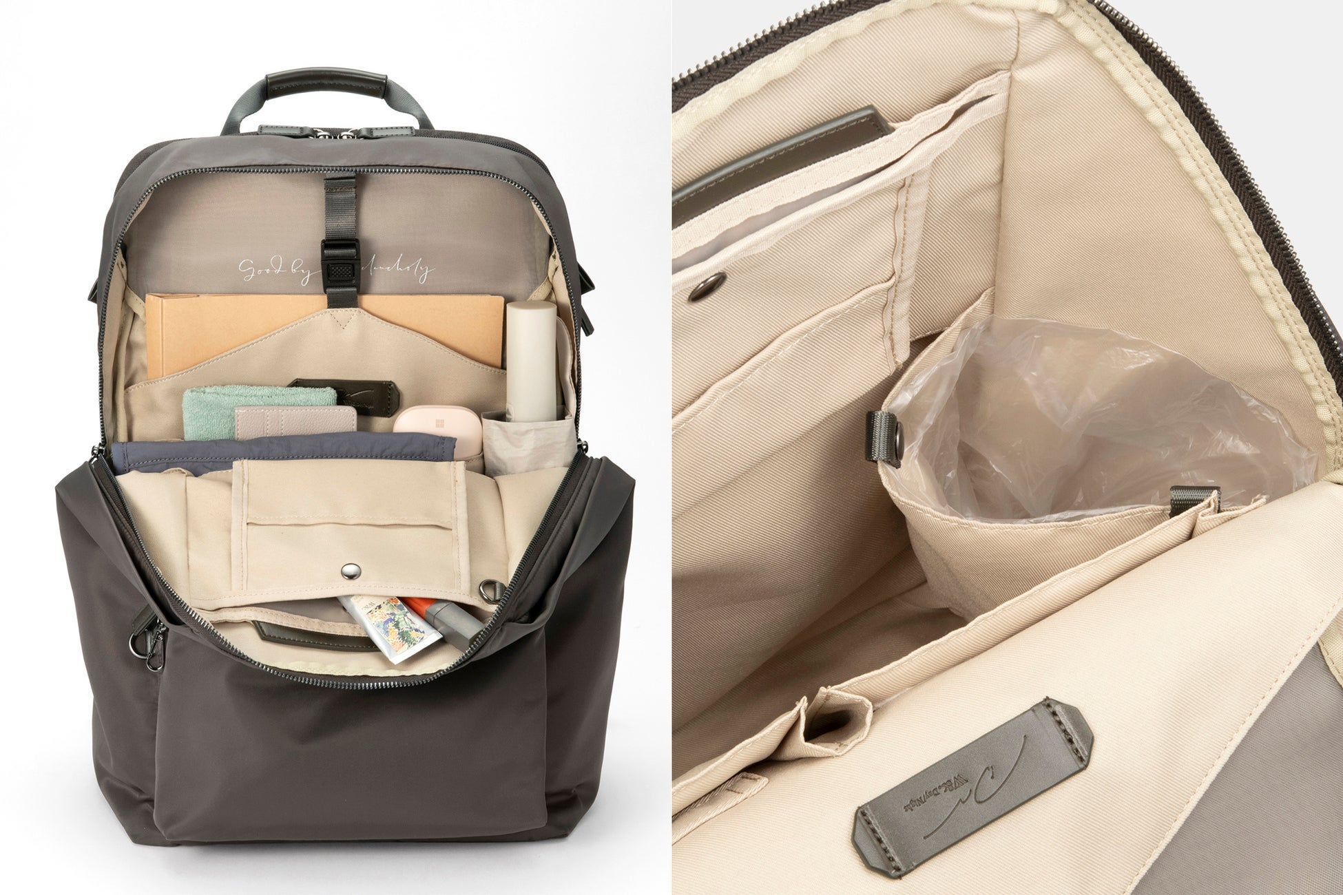 内装には、ポケットティッシュ専用ポケット、簡易ゴミ箱としても使えるボトルホルダー、デッドスペースを活用したハンモックポケットなどの、ユニークな機能を多数搭載しています。さらに、本体生地に撥水加工を施し、雨除けフラップ付きのPC収納部も備えているため、雨の日も安心して使用できます。