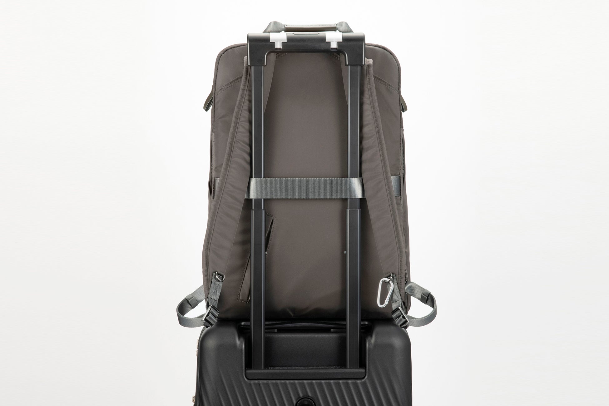 リュック背面に、スーツケースのプルドライブハンドルにリュックを固定できるセットアップベルトを配置。
