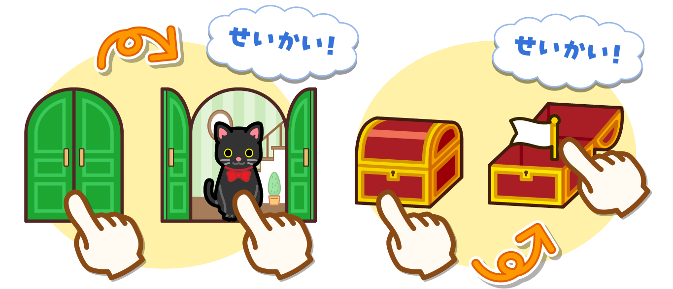 扉を開けたり、宝箱を開けたりと、簡単操作で遊ぶことができます。