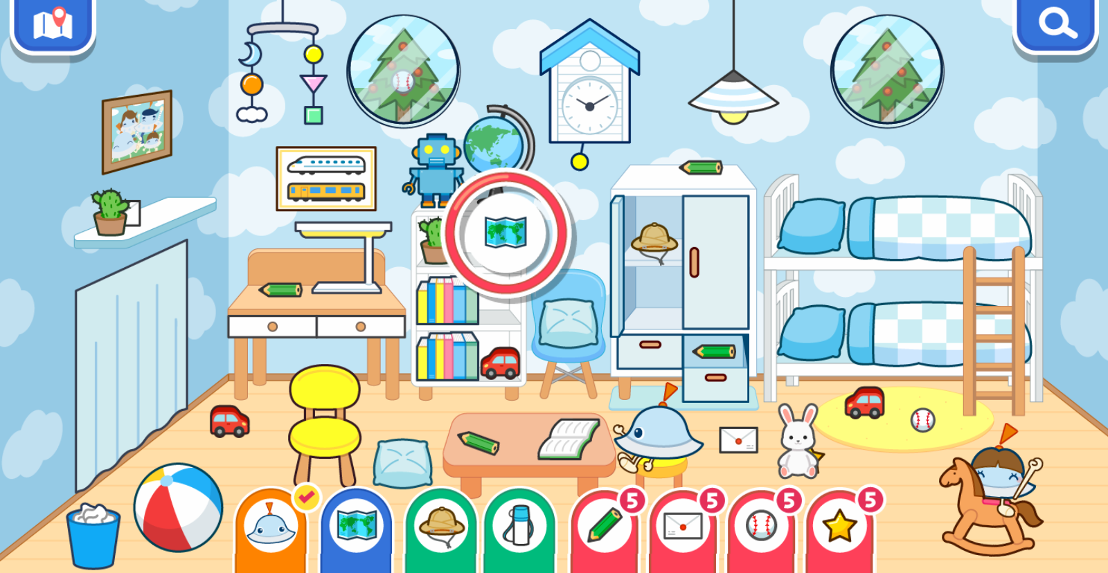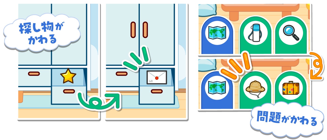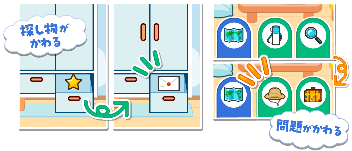 一部の探すアイテムは、遊ぶたびに種類や場所が変化するため、繰り返し遊んでも飽きることなく楽しめます。