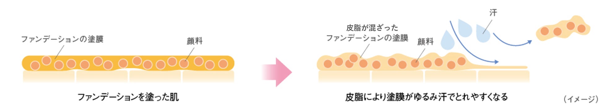 化粧崩れは、時間の経過とともに肌から分泌される皮脂がファンデーションの塗膜と混ざり、ゆるんだ塗膜が汗などではがれることによって起こります。つまり、ファンデーションと皮脂が混ざらないようにすることが化粧くずれを防ぐポイントです。そこで「リズムラスティングウェア」では、皮脂固化技術と撥水塗膜技術を搭載した『デュアルコントロール処方』を採用。2種のパウダーが皮脂を吸着、固化してトラップし、ヴェールポリマーが汗をはじきます。