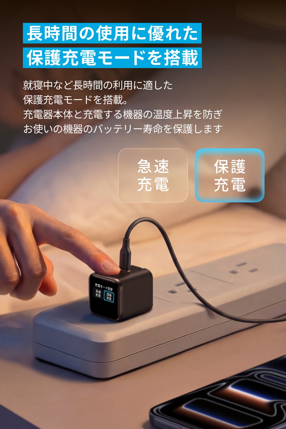 - 最大45W出力で急速充電可能:最大45W出力に対応し、接続したiPhoneのバッテリー残量に応じて自動で出力を最適化するため、本体を保護しながら効率的に急速充電できます。充電時の発熱を最小限に抑える「保護充電モード」も本体上部のタッチ式ボタンで選択することができます。