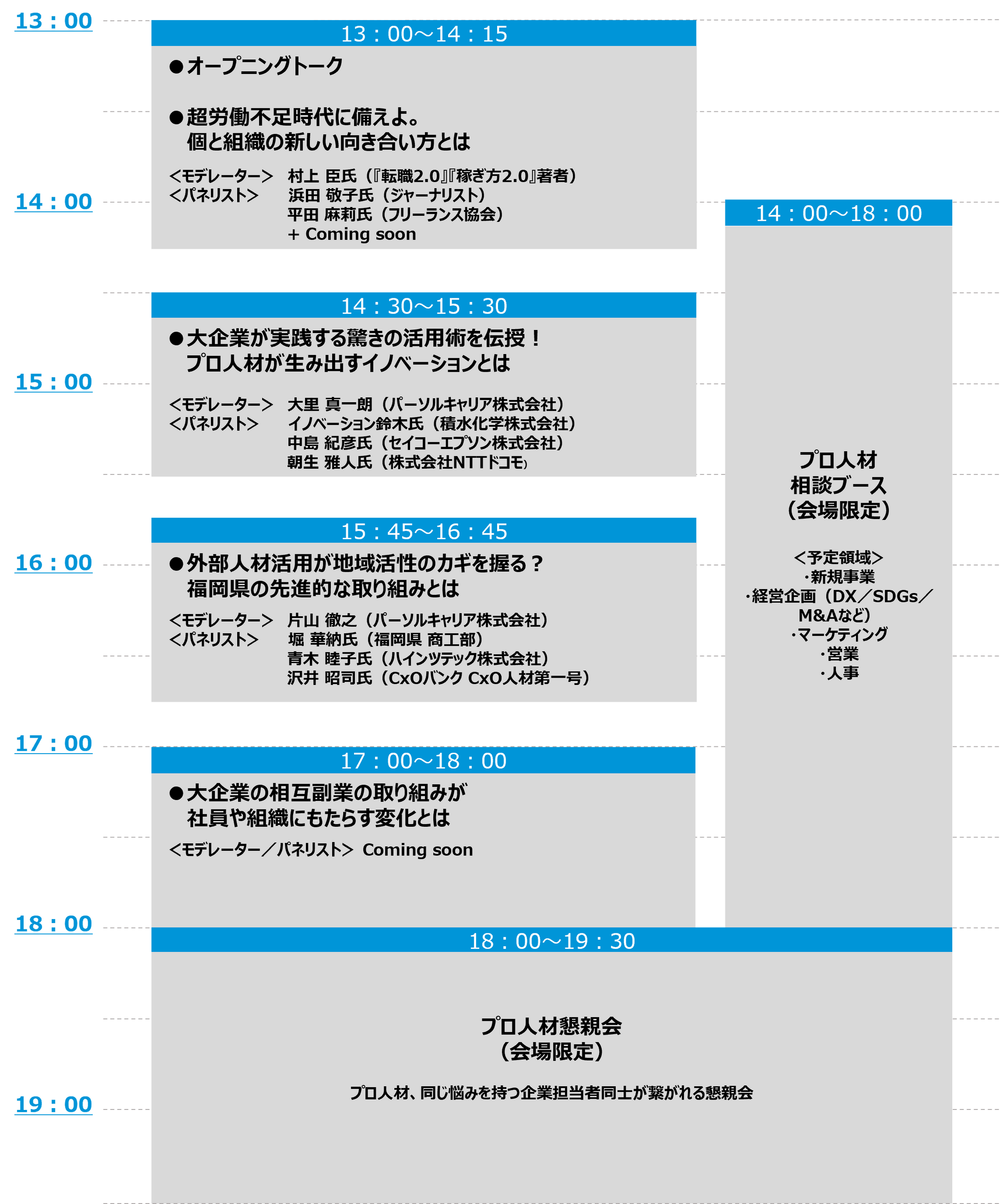 本イベントは、プロ人材を活用し課題解決を行う企業担当者、各領域で高い活躍するプロ人材をゲストにお招きし、「プロ人材活用の成功例や活用方法に関するトークセッション」や「プロ人材と直接会話できる相談ブース※」など、課題解決のヒントとなるリアルな情報をお届けします。