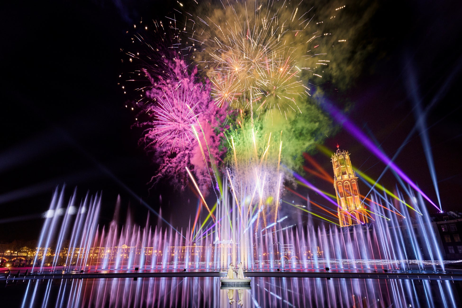ヨーロッパの町並みのライトアップや独自に展開するイルミネーション演出、運河に煌めく光、巨大なツリー演出、天高く打ち上がる噴水、ドムトールンの光演出からの壮大な