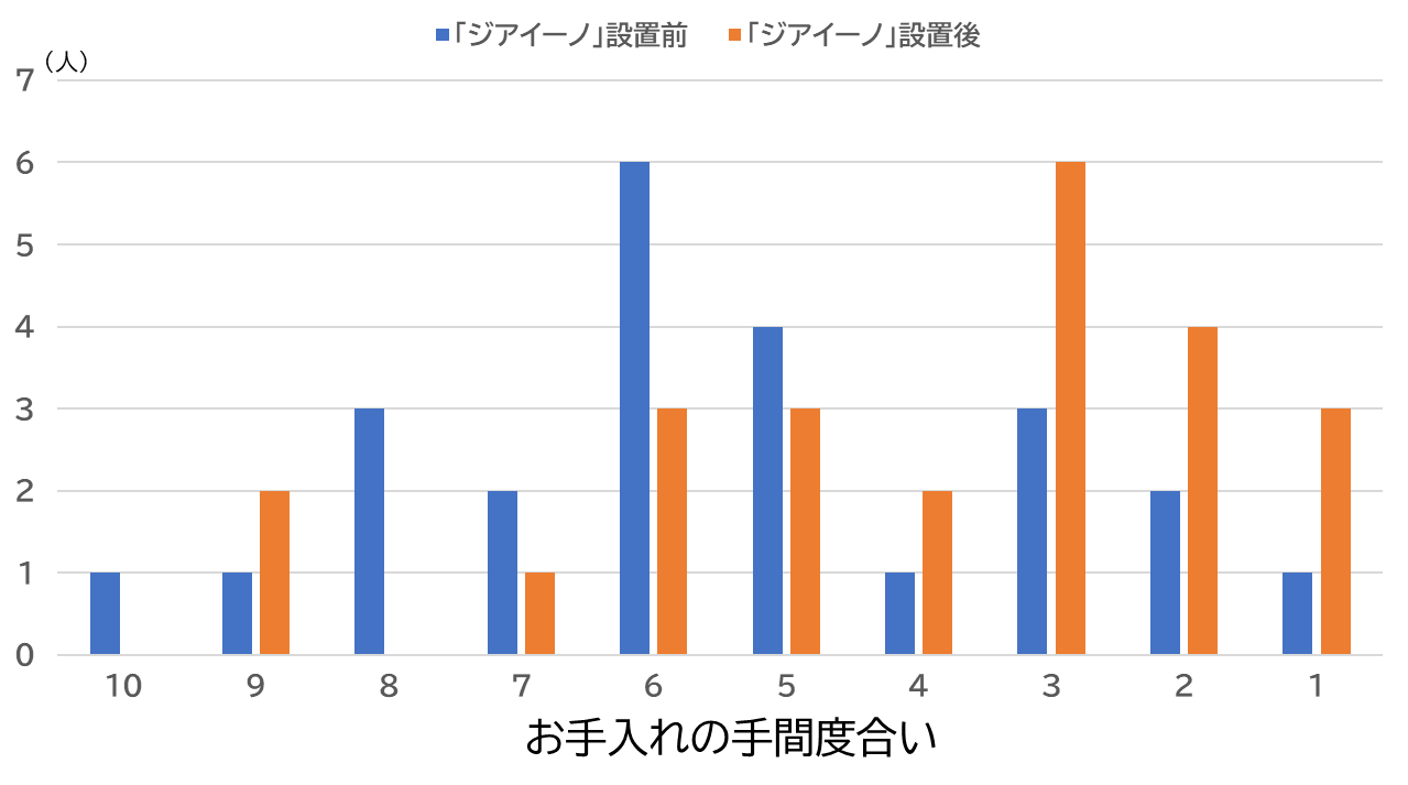 また、設置したゴールドジム、東武スポーツのスタッフの方々に、「ジアイーノ」設置前と設置後の更衣室やロッカーのニオイケアの手間を10段階で評価していただきました。設置前の手間は平均5.4に対し設置後の手間は平均3.9と、ニオイケアの手間軽減に「ジアイーノ」が役立ったということもわかりました。(2022年6月実施、N=24、当社調べ)