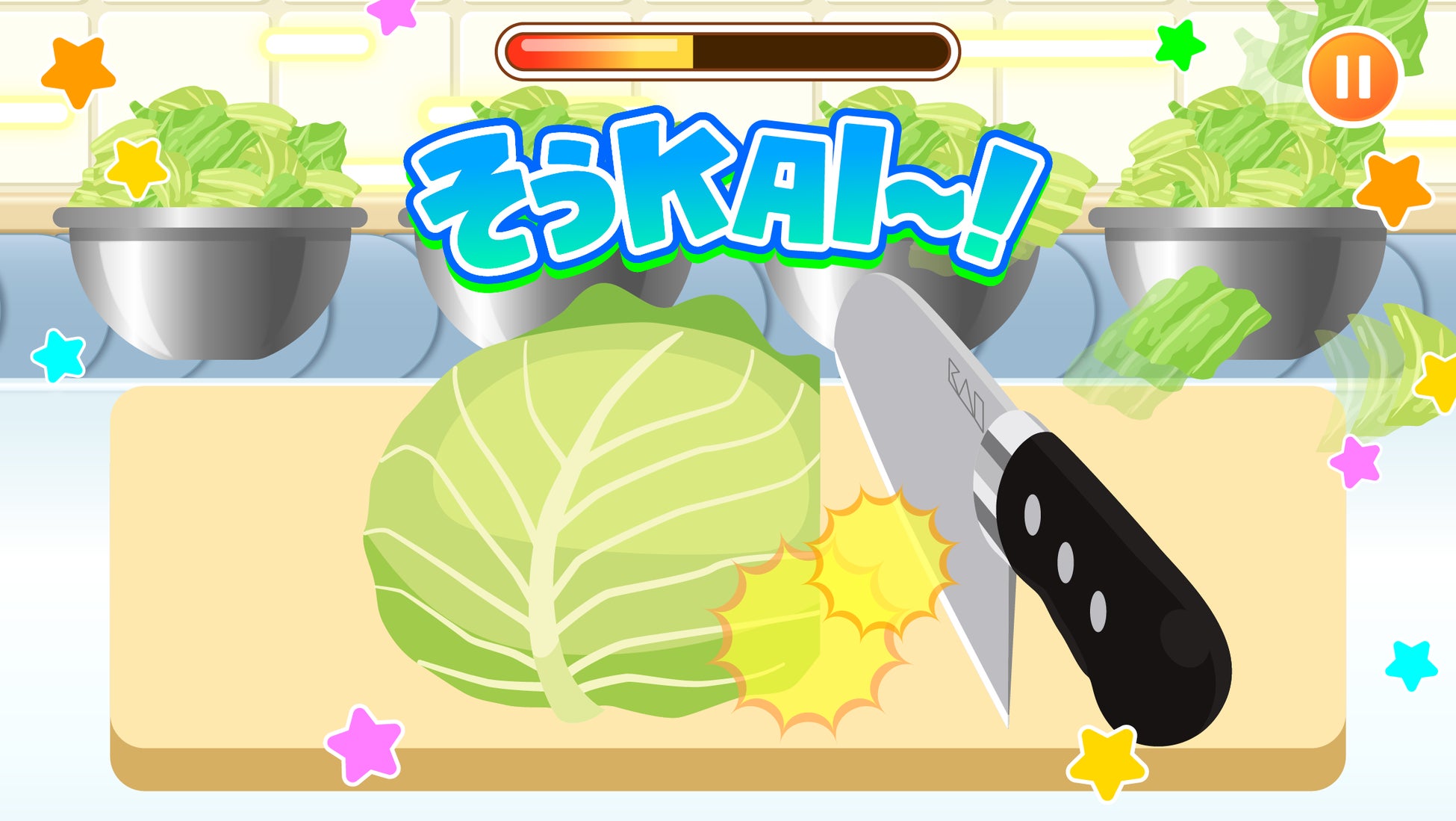 おいしいサラダを作るために、野菜を包丁やピーラーで切るゲームです。爽快な音とともに、制限時間内にキャベツ、パプリカ、にんじんといった様々な野菜を切ります。より多くの野菜を切って、おいしいサラダを作りましょう。