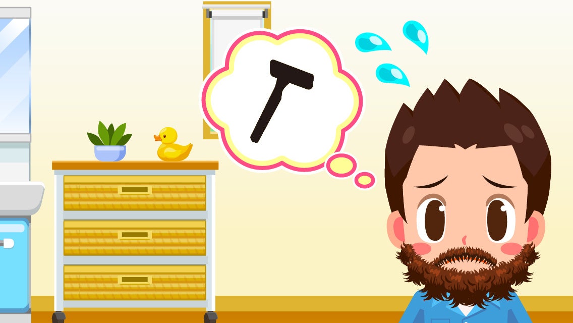 眉、ひげ、爪など身だしなみを整える道具が見つからずに困っている、ママ・パパが登場します。一緒におうちの中を探して、貝印の製品を見つけましょう。製品を見つけたら、それぞれの刃物の正しい使い方を学びながら、切ったり、剃ったりする体験ができます。