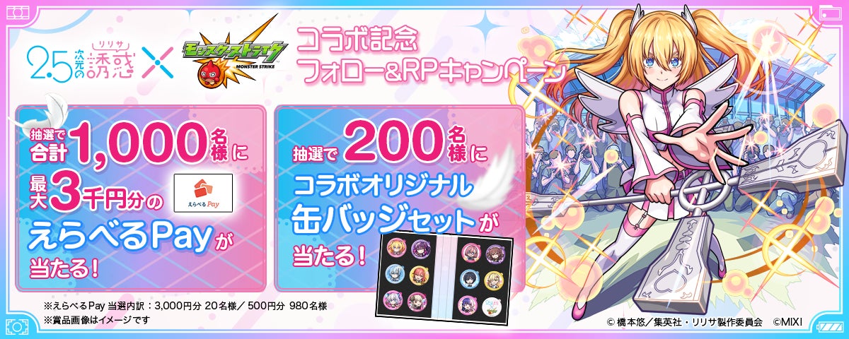 株式会社MIXI(東京都渋谷区、代表取締役社長 上級執行役員 CEO:木村 弘毅)は、スマホアプリのひっぱりハンティングRPG「モンスターストライク」(以下モンスト)において、TVアニメ「2.5次元の誘惑」との初コラボを4月13日(日)12:00より開催します。