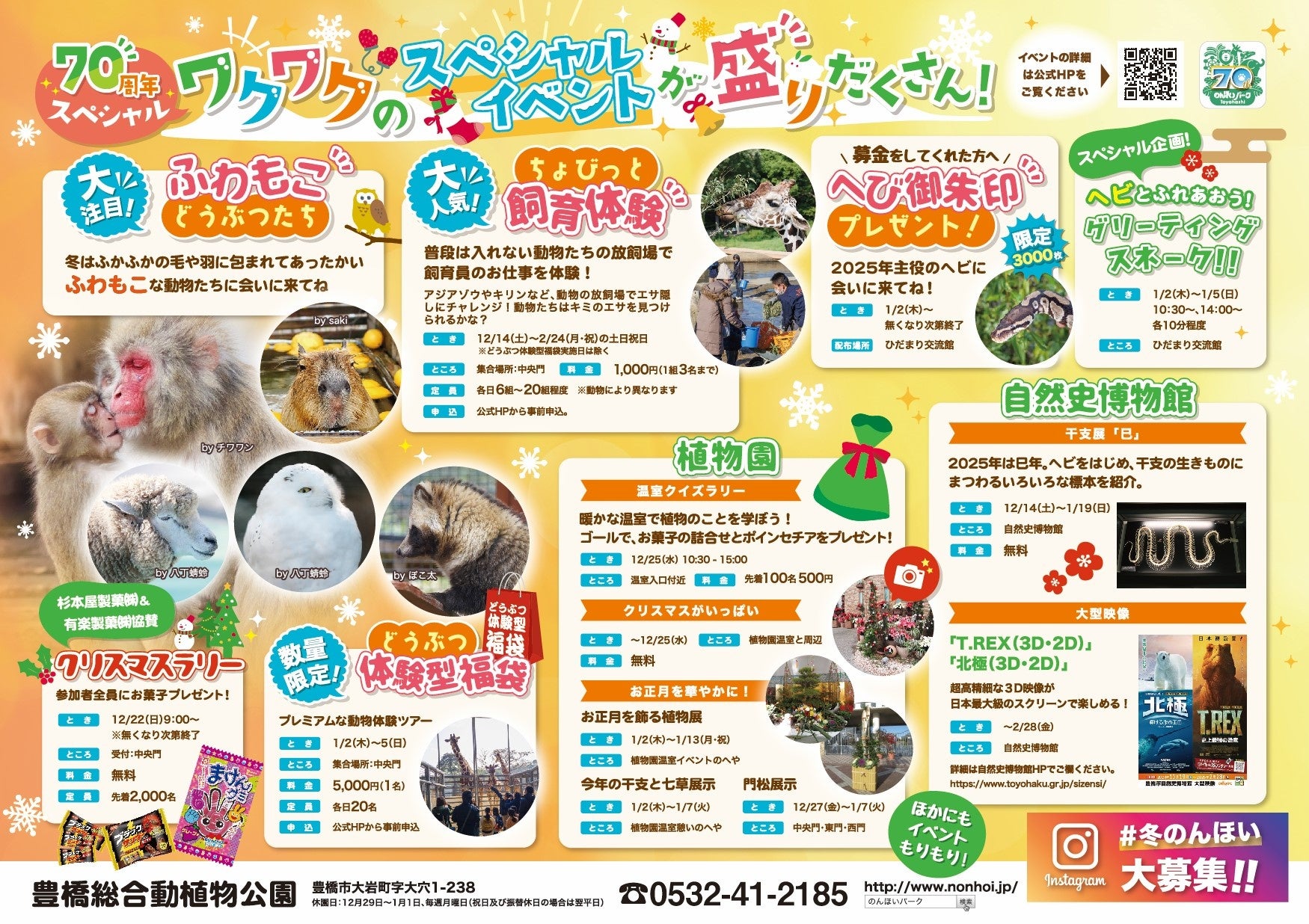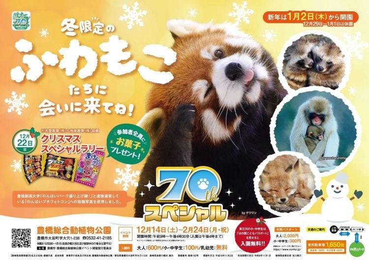 今年、70周年を迎えた豊橋総合動植物公園(のんほいパーク)では、12月14日(土)から2月24日(月・祝)まで、冬のイベントを開催します。70周年スペシャルの今回は、体験型イベントが盛りだくさん!