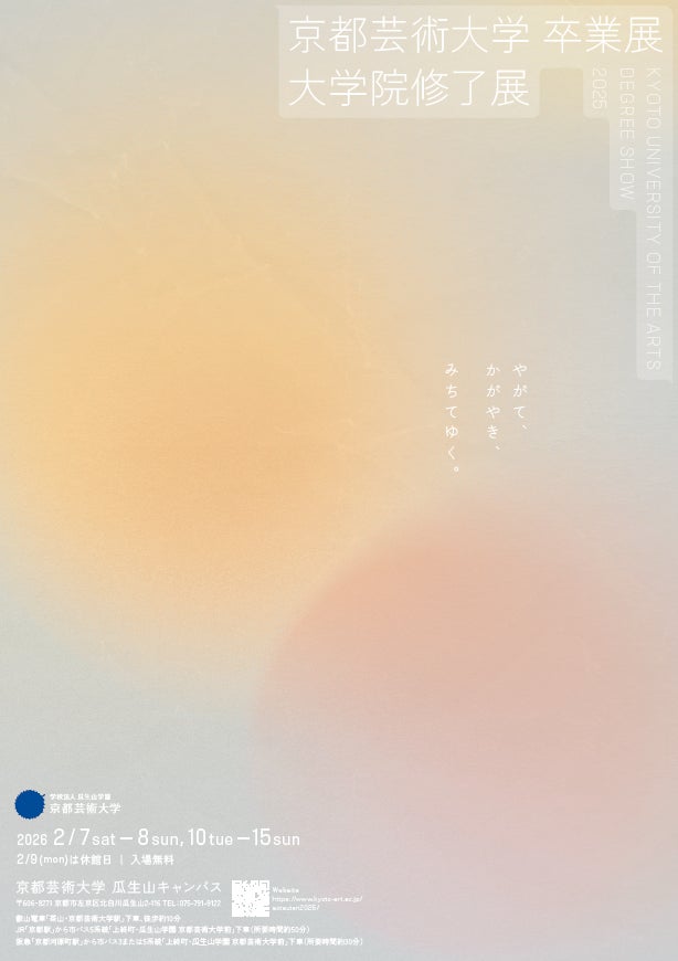 本学の通学課程では、2026年2月7日(土)から15日(日)まで「京都芸術大学 卒業展・大学院修了展」を開催します。同展では80,000㎡を超える瓜生山キャンパスで学生たちの卒業制作作品を一堂に展示。会期中には、学科ごとに教員やゲスト講師による講評会を対面・オンラインで実施します。