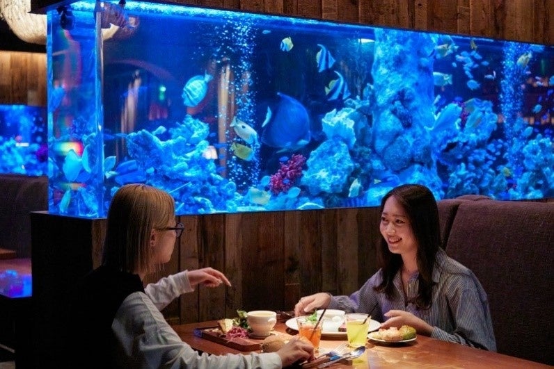 日本最大級となる300坪、300席の店内は、圧倒的な存在感を放つ9面の巨大アクアリウムを設置し1万匹を超す熱帯魚がお出迎えいたします。まるで水族館のような、ゆったりした空間で、デートや女子会のご利用でも、お子様と一緒に、ママ会でも十分に満喫していただけます。