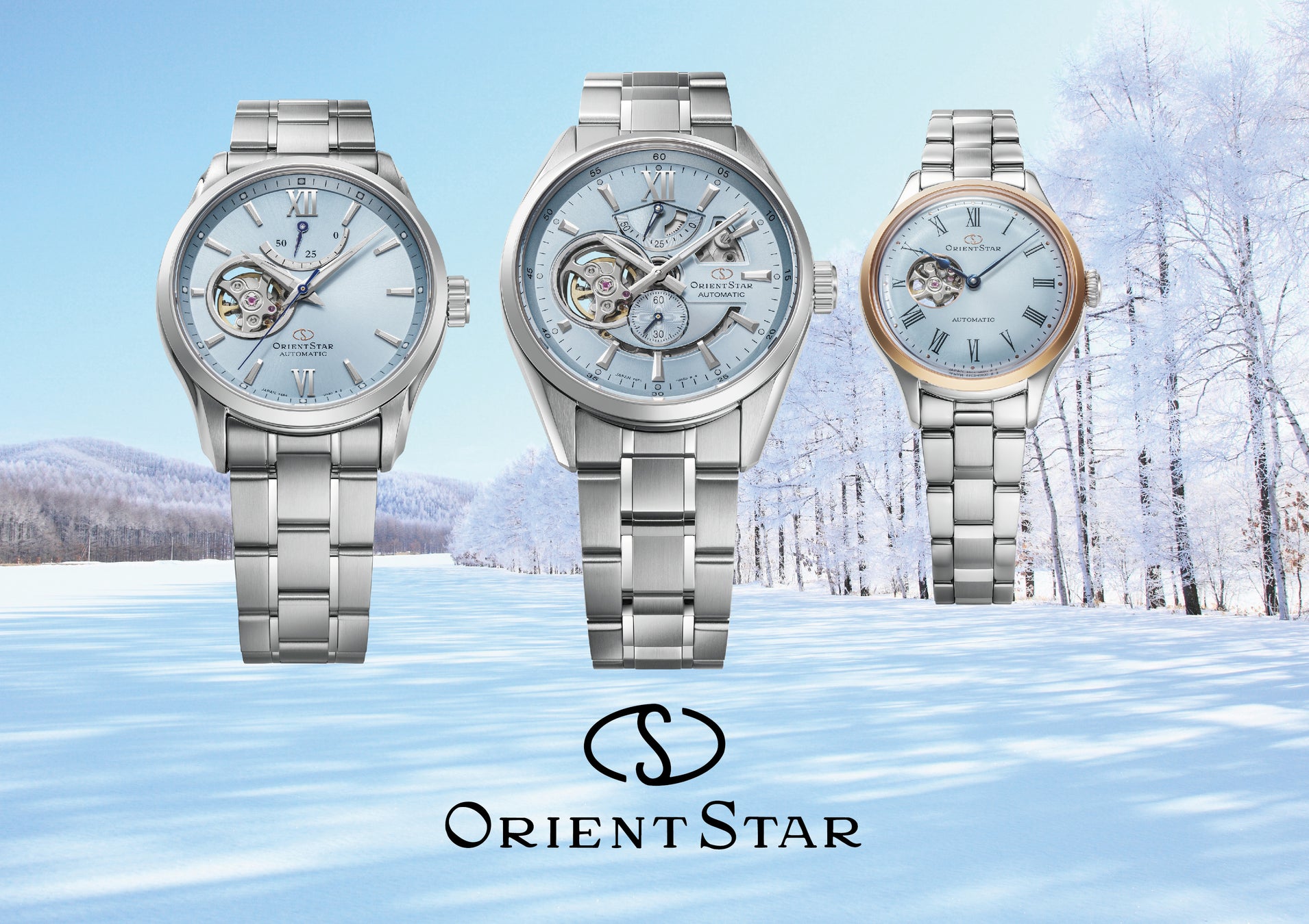 スポーティーなテイストにあふれるコンテンポラリーコレクションの『モダンスケルトン』と『セミスケルトン』は、それぞれ特長的なオープンワークを施した文字板にスカイブルーとマッチしたネイビーの小秒針や秒針とパワーリザーブ針を配しています。クラシックコレクションの『クラシックセミスケルトン』レディースモデルはまた、スカイブルー文字板を強調するように温かみのあるピンクゴールド色のベゼルが取り巻き、小ぶりなケースに優美なタッチを加えています。3モデルともピンクゴールド色のOSマークが空気中を漂う雪の結晶の輝きを表現しています。
