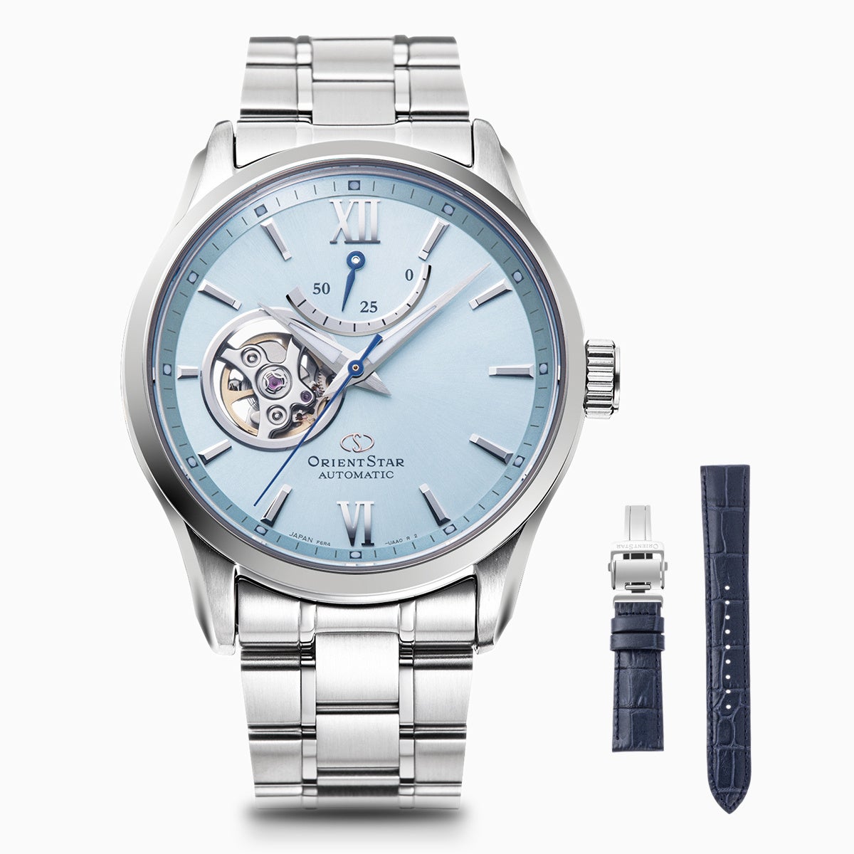 Moving Blueのテーマは、世界の多くの人にオリエントスターを着けていただきたいという想いから始まりテーマに共通するダイヤルカラーとして、世界をつなぐ空や海の色が用いられています。第5弾となる新作のテーマは「雪景色」。きれいな雪景色に映り込んだ澄んだ空気感が淡いブルーの色彩で文字板に表現されています。印象的なスカイブルーに彩られた文字板にはピュアな透明感とともに上質なエレガンスさが漂います。