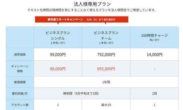 概要: | 期間中、文字起こし料金プランのビジネスプランを割引価格で提供します。 ビジネスプラン シングル:99,000円(税込)➛88,000円(税込) 11,000円引き ビジネスプラン チーム:792,000円(税込)➛693,000円(税込) 99,000円引き |