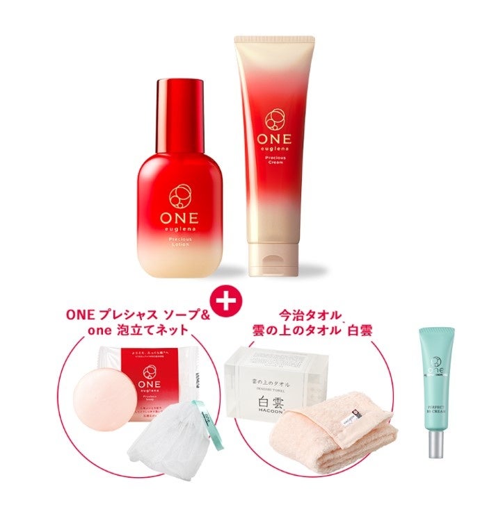 「ONE プレシャス ローション」と「ONE プレシャス クリーム」をセットでお買い上げいただいたお客様には、発売記念のご購入特典として、泡をオイルでコーディングする「オイルバブル製法」を初採用し、とろっとした泡が、くすみケアをしながらうるおいをキープする「ONEプレシャスソープ[非売品]」他、下記をプレゼントいたします。