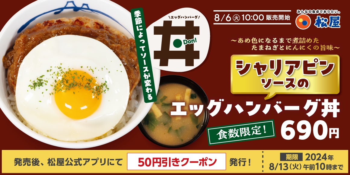 また、2024年8月6日(火)10時~8月13日(火)10時までモバイルクーポンにてご注文いただくと、「シャリアピンソースのエッグハンバーグ丼」が50円引きの640円にてお買い求めいただけます。この機会にぜひ、お召し上がりください。