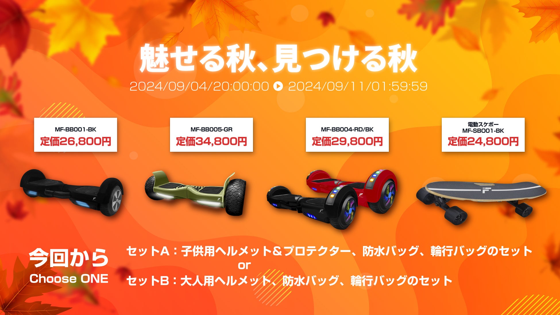 楽天市場「Show!t」では、9月4日(水)20:00~9月11日(水)01:59の期間中、MEISTER.F電動バランスボード、電動スケートボードを購入すると、12,000円相当のキッズプロテクターまたはヘルメット、収納バッグ、さらに防水バッグをプレゼントいたします。電動バランスボードは重心移動で操作できバランス感覚を養うのに最適です。電動スケートボードはリモコン操作で簡単に走行を楽しめます。ご家族でぜひお楽しみください。