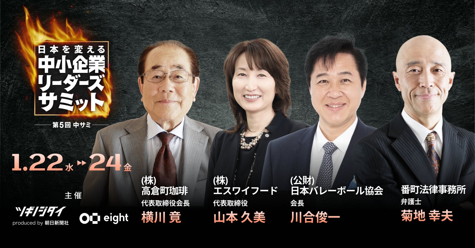 Sansan株式会社が提供する名刺アプリ「Eight」では、朝日インタラクティブ株式会社が運営する中小企業向けウェブメディア「ツギノジダイ」とともに手掛けるイベント「第5回 日本を変える 中小企業リーダーズサミット」(以下、第5回 中サミ)を開催します。1月22日(水)~24日(金)の3日間、オンライン形式で実施します。「すかいらーく」創業者であり75歳で再起業した株式会社高倉町珈琲 代表取締役会長 横川 竟氏や、主婦から居酒屋チェーン「世界の山ちゃん」の代表に転身した株式会社エスワイフード 代表取締役 山本 久美氏や、など40名を超える登壇者が「中小企業の課題を解決する講義」を提供します。