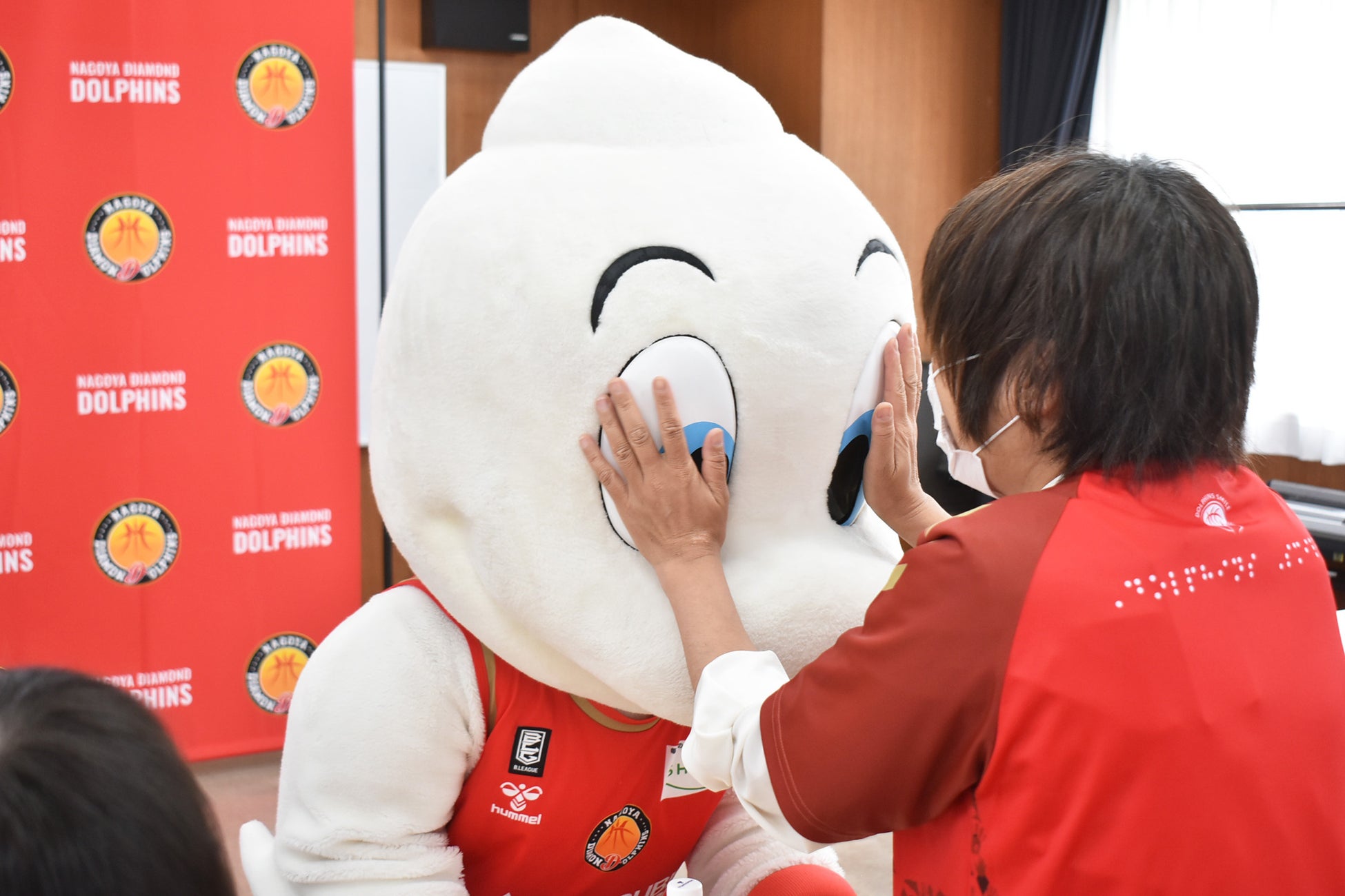 贈呈式に参加していた名古屋ライトハウスのスタッフに、点字シャツを着てもらったり、公式マスコット『ディーディー』と触れ合いの時間を設けました。全盲のスタッフからは、「服についている点字は初めてで新鮮」、「チーム名が英語で書いてあるね」、「ディーディーと握手でコミュニケーションできてよかった」など、それぞれ感想を語りました。