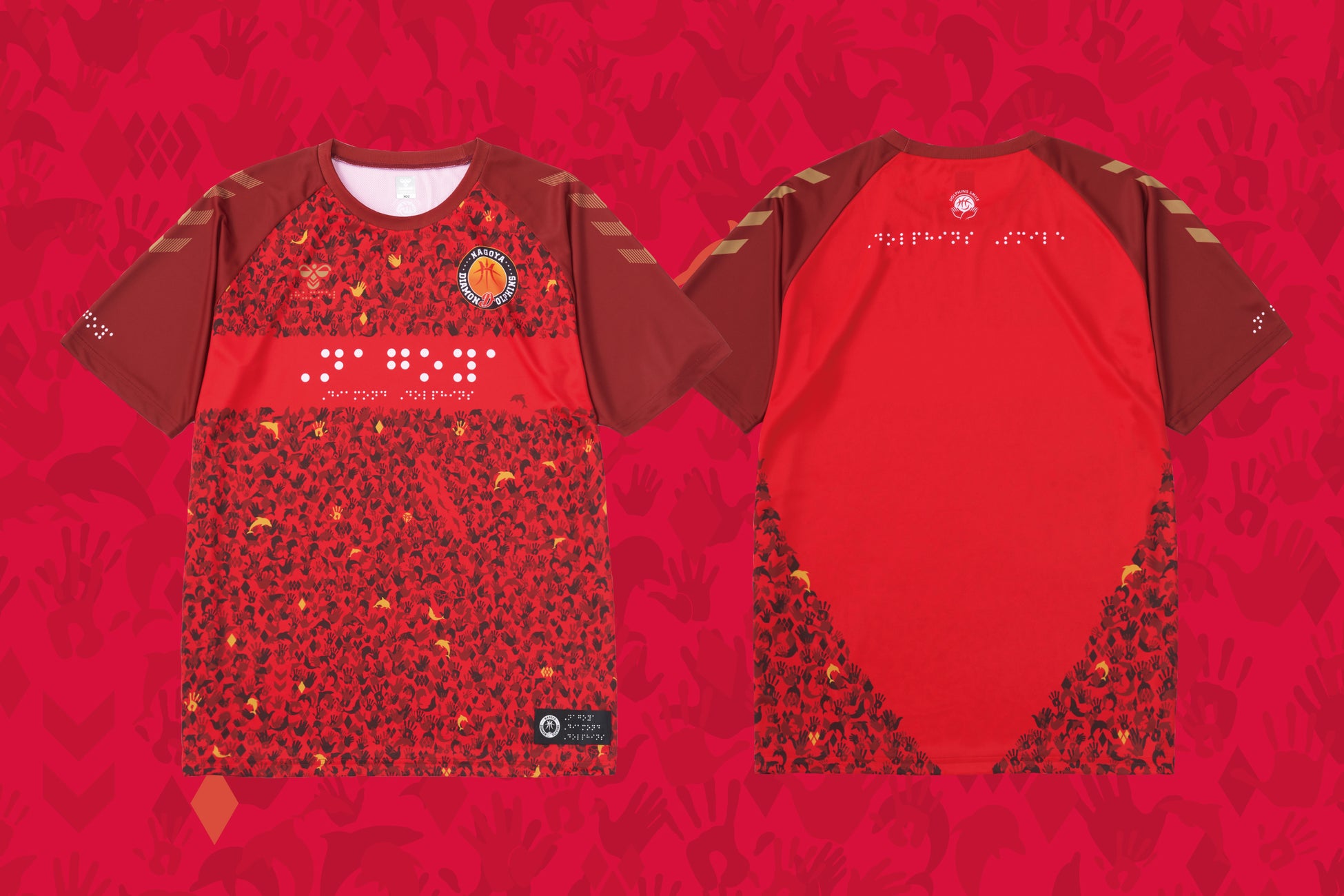 点字シャツは、2023年秋から名古屋ダイヤモンドドルフィンズ(名古屋D)をはじめとする5クラブとヒュンメルが実施したチャリティーシャツ。目の見えない、見えるに関わらず、手をたたいて声援をおくる姿をイメージし、裾部には指先で感じられる凹凸の点字加工でクラブ名を表したシャツで、売上の一部などを各クラブのホームタウンエリアでの視覚障がい者支援に繋げました。