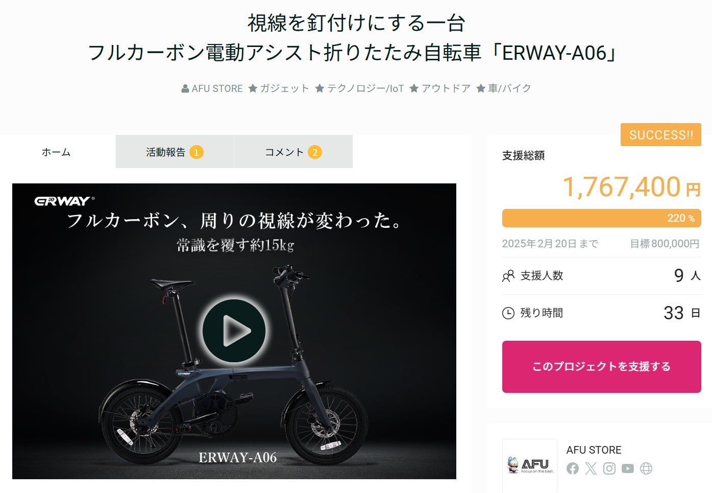 鑫三海株式会社(SINSANKAI CO., LTD.)が運営する、“驚きと感動のある世界水準の良品で、みなさまに豊かな暮らしをお届けする”AFU(アフー)ストアは、フルカーボン電動アシスト自転車「ERWAY-A06」の販売をクラウドファンディングサイトGREEN FUNDINGで、2025年1月17日に開始し、公開後12時間で目標金額を達成しました。