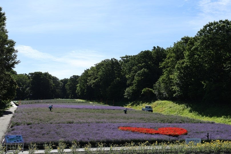 既に見ごろを迎えているラベンダー、サルビアやマリーゴールドに加え、西洋アジサイのアナベルの美しい白い花が満開となりました。ラベンダーパーク上部のラベンダーに加え、入園してすぐの場所にある「ひまわりガーデン」や、サルビアやマリーゴールドが競い咲く「彩の丘」、真っ赤なサルビアをハート型に植栽した「ハートの畑」も満開を迎えており、園内は見どころ満載です。