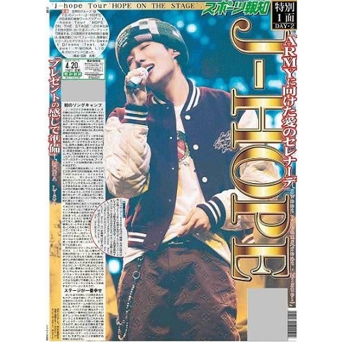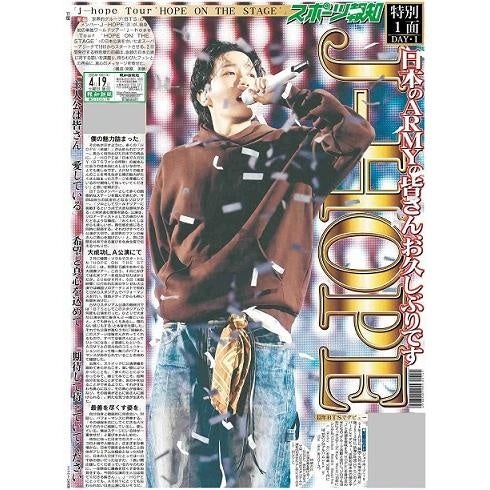 スポーツ報知を発行する報知新聞社(代表取締役社長・依田裕彦)は4月19、20日に開催されたJ-HOPEのさいたまスーパーアリーナ公演を記念しJ-HOPEを特集した特別1面新聞を販売しました。19日に販売された特別1面新聞(前編)と20日に発売された特別1面新聞(後編)、ライブの模様が芸能面に収録された21日付の新聞をスポーツ報知Yahoo!ショップで通信販売します。税込160円プラス送料で、特別紙面ページ以外は4月19日付、20日付のスポーツ報知東京版紙面になります。現地にお越しになれなかった方もこの機会にぜひお買い求めください。