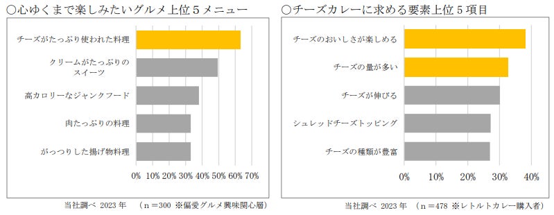 たっぷりの量を楽しみたいグルメとして、チーズが使われた料理は人気が高くなっています。また、チーズカレーに求める要素として、チーズの「おいしさ」「量の多さ」を求める声が多くあります。