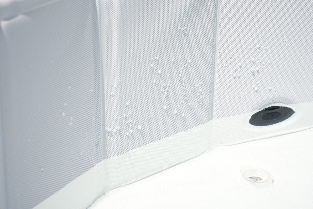 内側は破れにくいPVC素材を採用。PVCシートには格子状の凹凸があり、ワンちゃんがプール内で滑りにくいような工夫がされています。PVCシートの間には4.5mm厚の強度あるMDFボードが挟み込まれているため、ワンちゃんがプールの縁に脚をかけてしまっても、プールが折りたたまれる心配がありません。