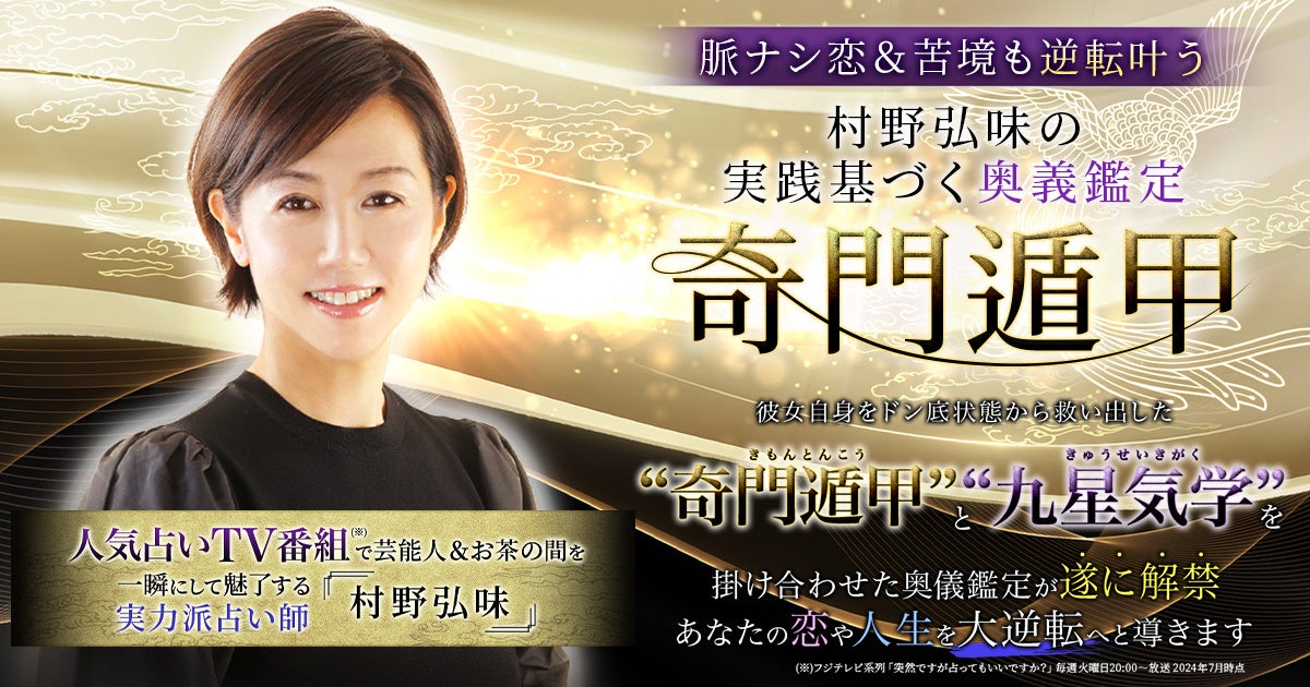 本コンテンツは、人気占いTV番組※出演で出演者やお茶の間を魅了する村野弘味による特別な鑑定を再現したものです。村野弘味氏自身をドン底から救い出した実体験に基づいた究極の方位術「奇門遁甲」を用いて、あなたの人生も恋も暴き大逆転へと導きます。生年月日や、鑑定時の奇門遁甲盤から金運、恋愛運、仕事運、人生運など目的に応じて、答えを示していきます。豊富なメニューラインナップを取り揃えておりますので、その中からメニューをお選びいただき、お名前や生年月日などを入力の上、購入することで鑑定の結果を閲覧いただけます。※フジテレビ系列「突然ですが占ってもいいですか?」毎週火曜日20:00~放送 2024年7月時点