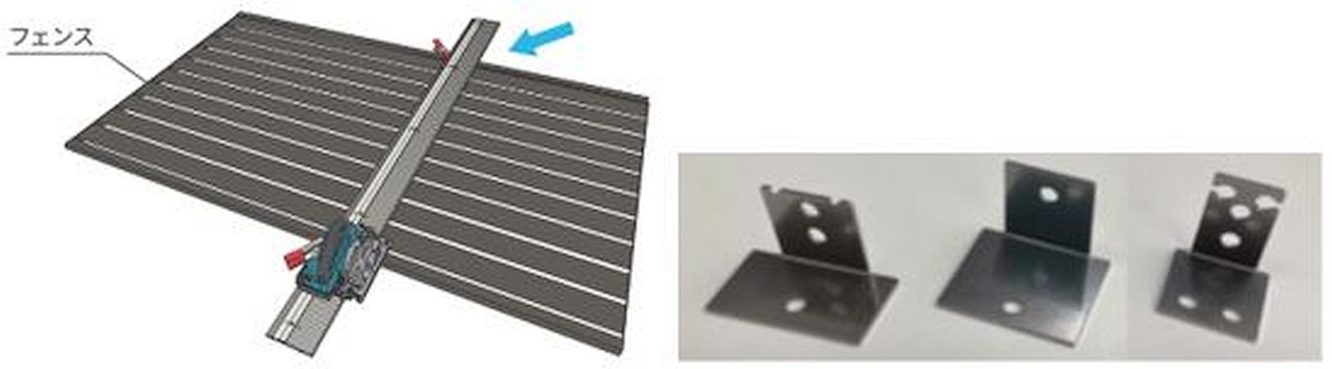 フェンス本体をばらすことなく1回で切断可能な切断治具と、部品取り付けの胴縁穴加工を簡易化する穴位置マーキング用のケガキ治具をセットにした治具です。切詰時の作業時間を従来と比較して約33%短縮できます。
