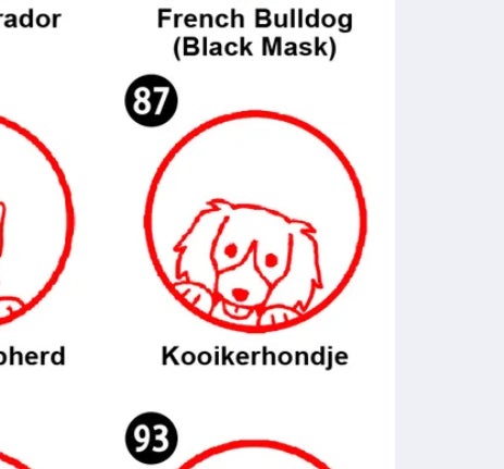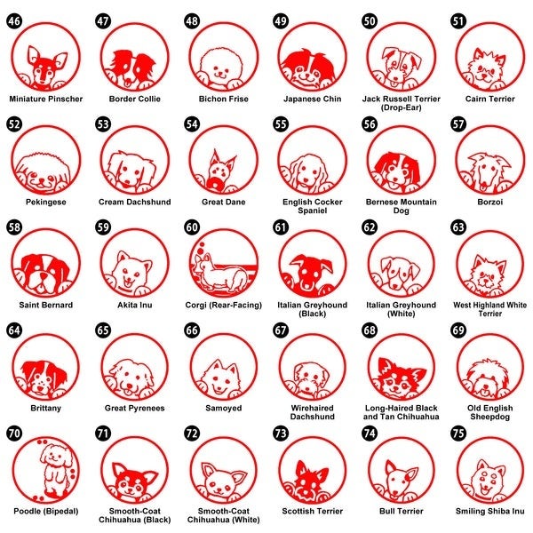 「いぬずかん」で選べるイラストは専属の女性イラストレーターによるこちらの133種類。1番~15番はいろんな表情やポーズのワンちゃんを、16番~133番はチワワやトイプードル、ダックスフントやヨークシャテリア、フレンチブルドッグ、コーギー、柴犬などなど、実にさまざまな犬種が選べるようになっています。