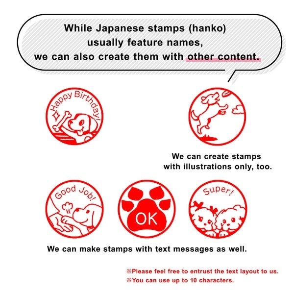 自分の名前を入れてサイン代わりに使うことはもちろん(※)、「炉場頭(Robert)」や「女亜吏(Mary)」などといったように漢字で英名を表現するグッズとして使ったり、「Congrats!」「Good job」などのメッセージを入れて犬好きどうしのコミュニケーションツールとして使うこともできます。またシンボルマークのように使いたい方は、名前や文字を入れずにイラストのみで作ることもできます。