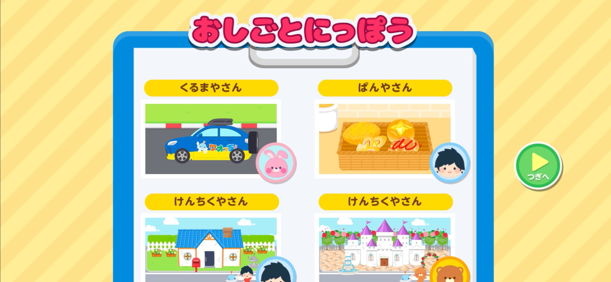 無料で体験できるおしごとは「くるまやさん」と「ぱんやさん」の2種類です。