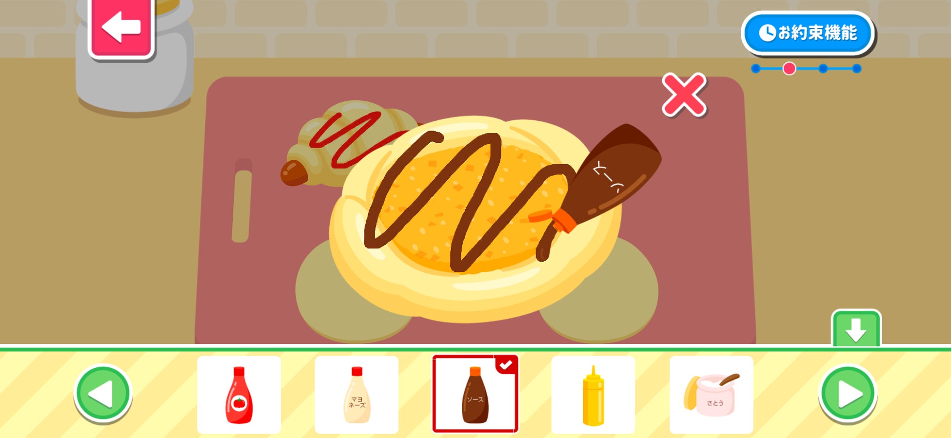 本アプリでは、お店にやってくるお客さんに合わせて、車・パン・建物などをつくる「ものづくり体験」が楽しめます。相手を思い浮かべながら形を選び、色を塗る工程を通して、創造力・表現力を育むとともに、相手の気持ちを考える姿勢を自然に養います。