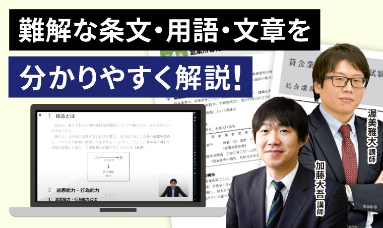 貸金業務取扱主任者試験で出題される貸金業法等は、非常に難解な内容の法律になっていて、その難解な内容・条文のまま出題されます。本講座では、難解な内容の法律を丁寧に解きほぐしつつ、ポイントを押さえながら講義を展開していきます。これから初めて条文に触れる方や、過去に挫折した方でも安心して学習を進めることができます。