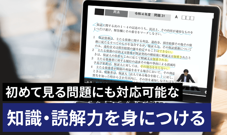 しかし、特にインプットテキストでは、過去問以外の知識なども掲載されるため、学習範囲が広くなる傾向にあります。 そこで、この講座では、過去問を中心とした知識のインプットを徹底し、学習範囲がムダに広くならないようにしています。このテキストでのインプットと徹底的な過去問主義のアウトプットを通して、超効率的・効果的でムダのない学習の実現が可能となります。