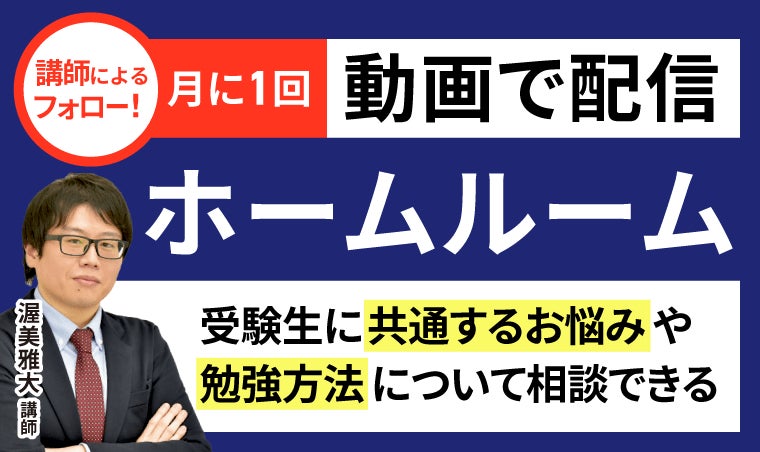 質問制度では、講師がすぐに直接質問に答えるため、疑問を残したまま学習を続けるということがありません。 またホームルームでは、受講生へのアンケートをベースに講師が毎月動画コンテンツをお届けしています。受講生の質問や悩みに応じた学習方法や学習環境の整え方、心構えなどの受験テクニックをお伝えするので、途中で挫折することなく、自信を持って学習を進めていくことができます!