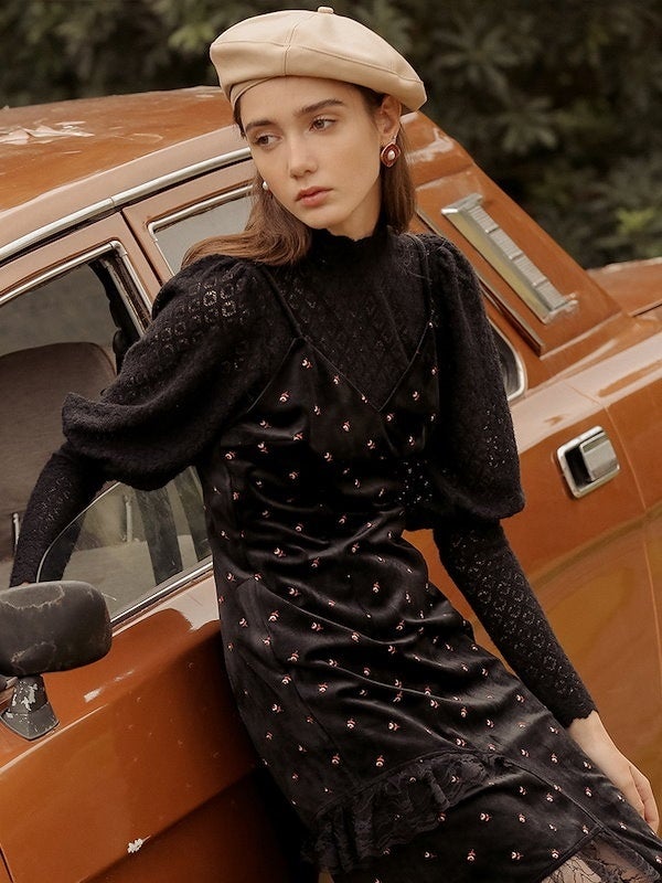 レースのニット地に首元のメロウデザインとバルーン袖がフェミニンな1枚。ミニ丈のキャミワンピとベレー帽でクラシカルなレディ風に。