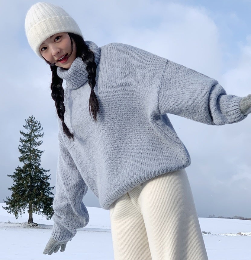 ワイドタートル&ボリューム袖にゆるっとしたサイズ感がキュート。春の注目色のブルーに、ビーニーとニットパンツは白でまとめて爽やかに。