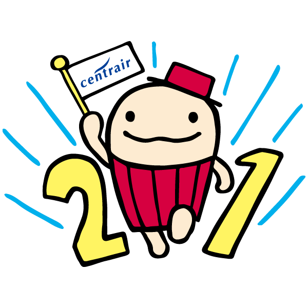 セントレアのオリジナルキャラクター「なぞの旅人フー」が、20周年の節目を経て、21年目へと明るく前に歩みだす姿をイメージしてデザインされたものです。