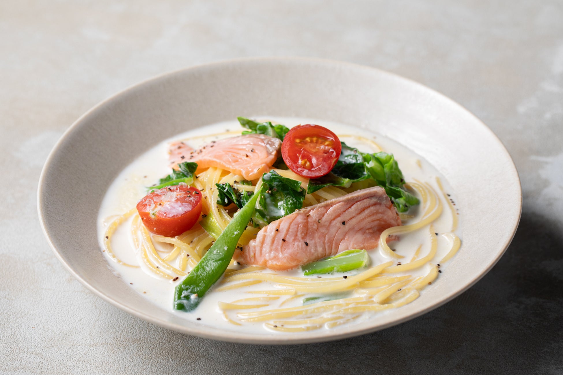 ランチのコースには脂が乗った旬のサーモンを使ったパスタが新しく登場。