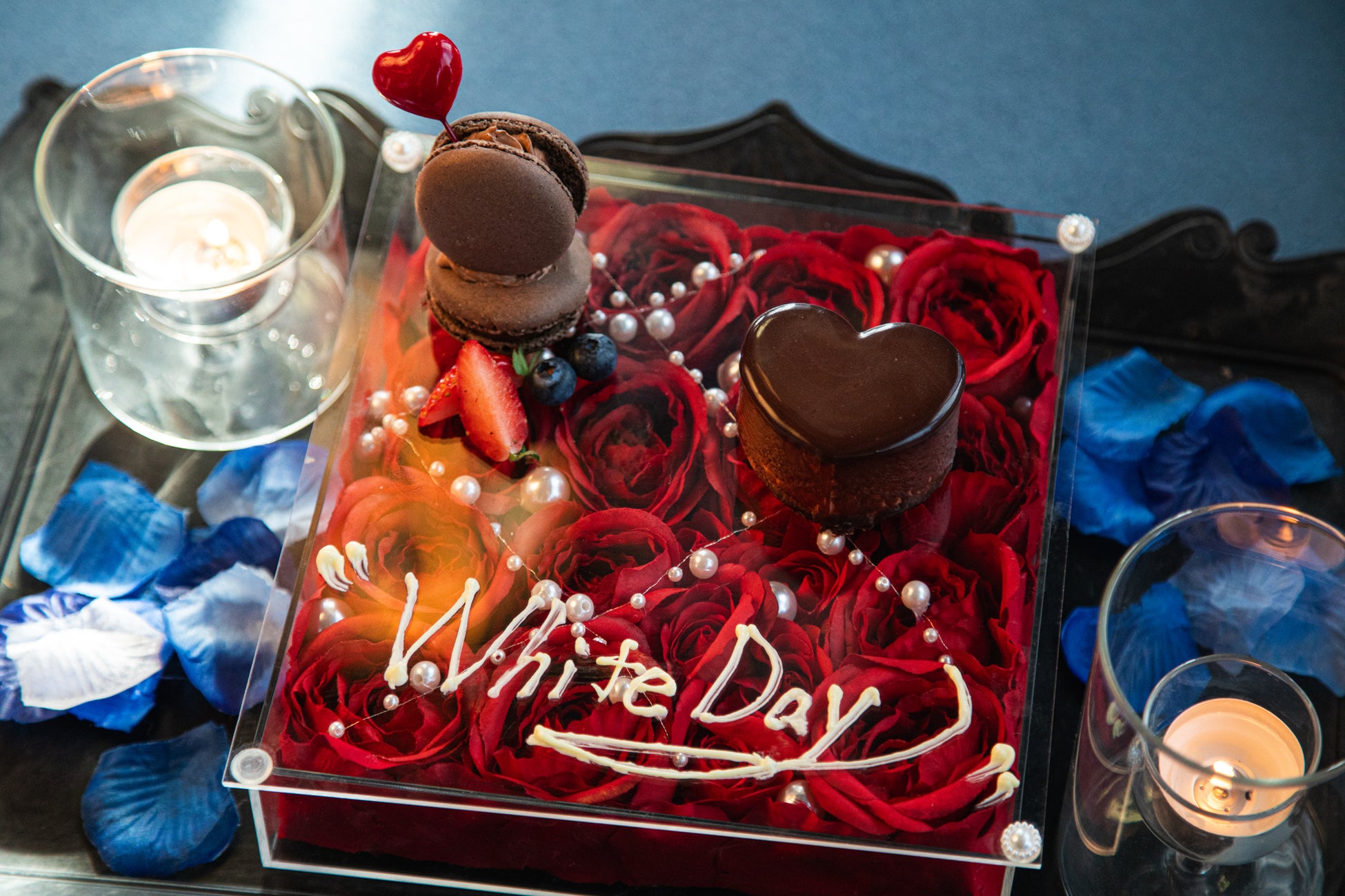 真っ赤な薔薇とハート型のチョコレートケーキがドラマチックなホワイトデーを演出してくれる。