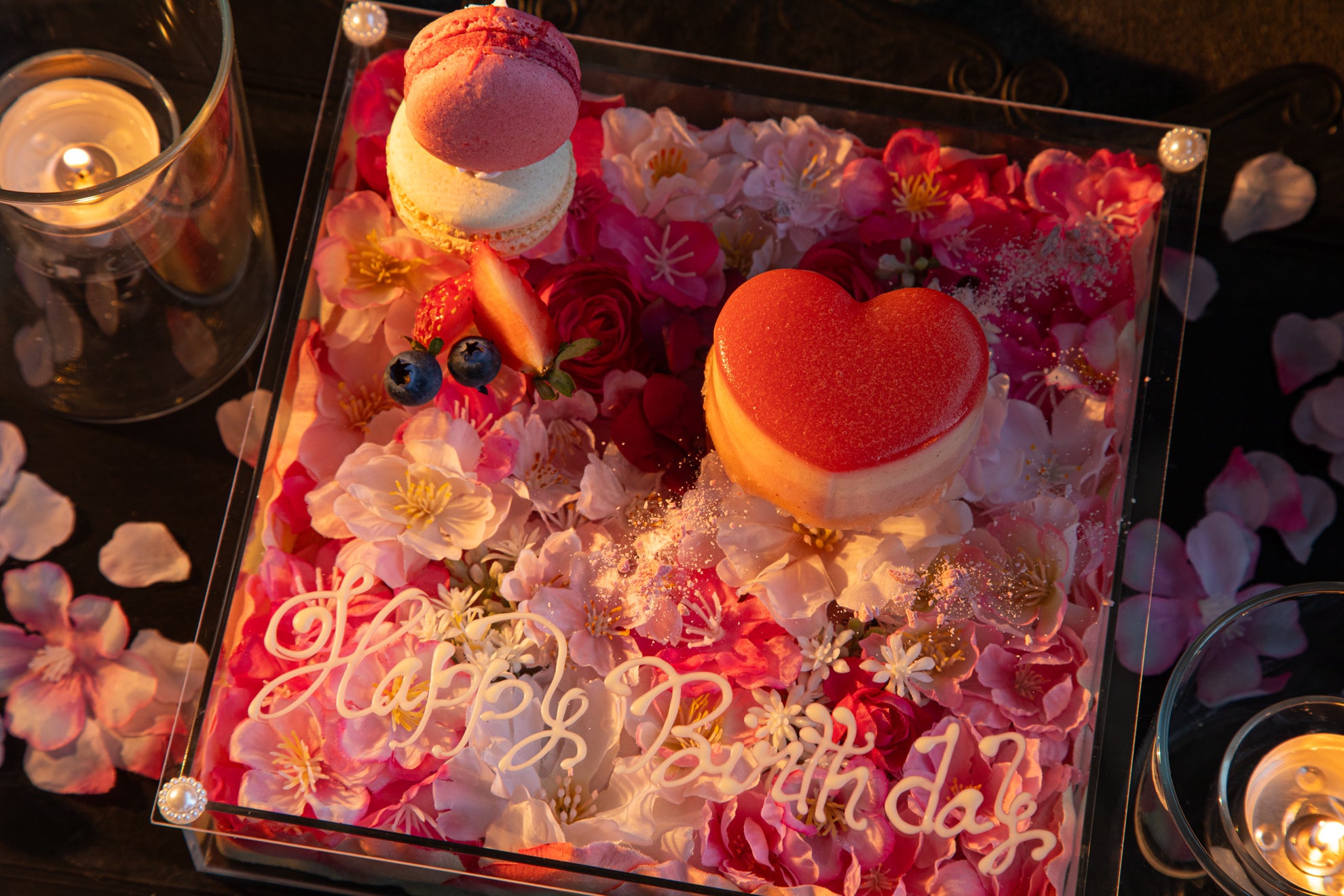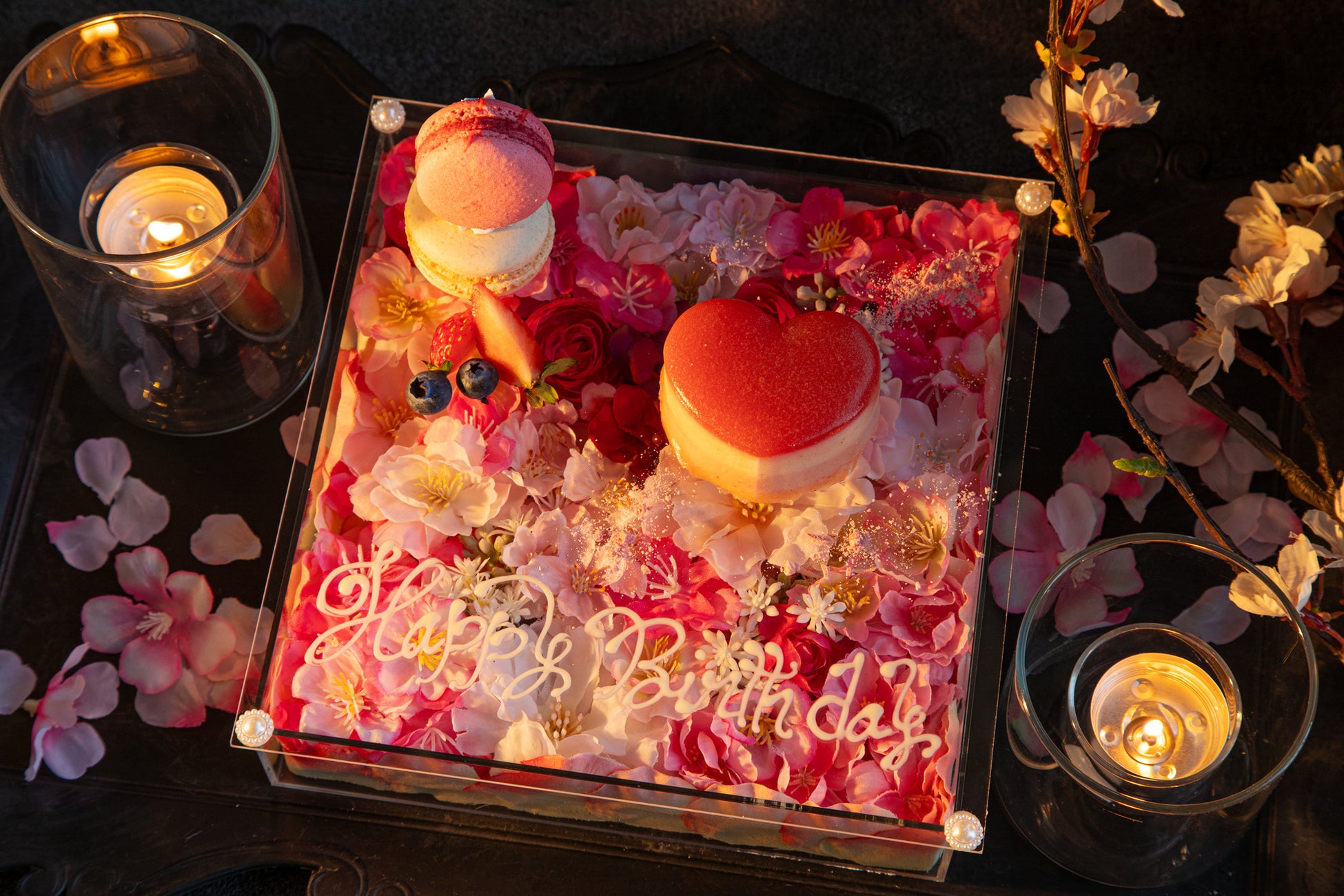 コースの最後、圧倒的にフォトジェニックな桜のボックスケーキにはメッセージを添えることができる。