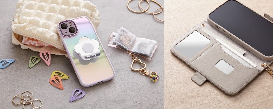 スマートフォンのケースは耐衝撃性があり、液晶画面への傷を防ぐ設計を採用。特に手帳型ケースには目元や口元をチェックできる便利なコンパクトミラーやカード収納ポケット付きです。液晶保護フィルムは液晶を守りながら画面を彩るフレーム付きガラスフィルムとフラッシュ撮影にも対応。妥協せず「わたし」の好みに合わせて選べるカメラレンズカバーもラインアップしています。