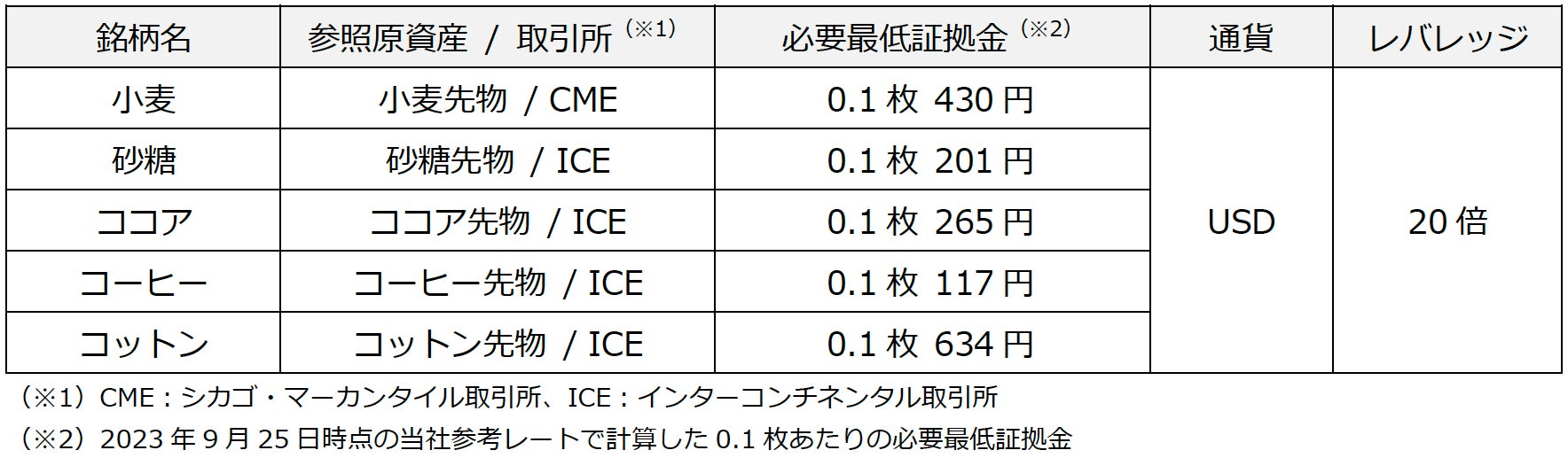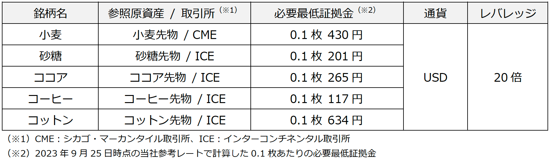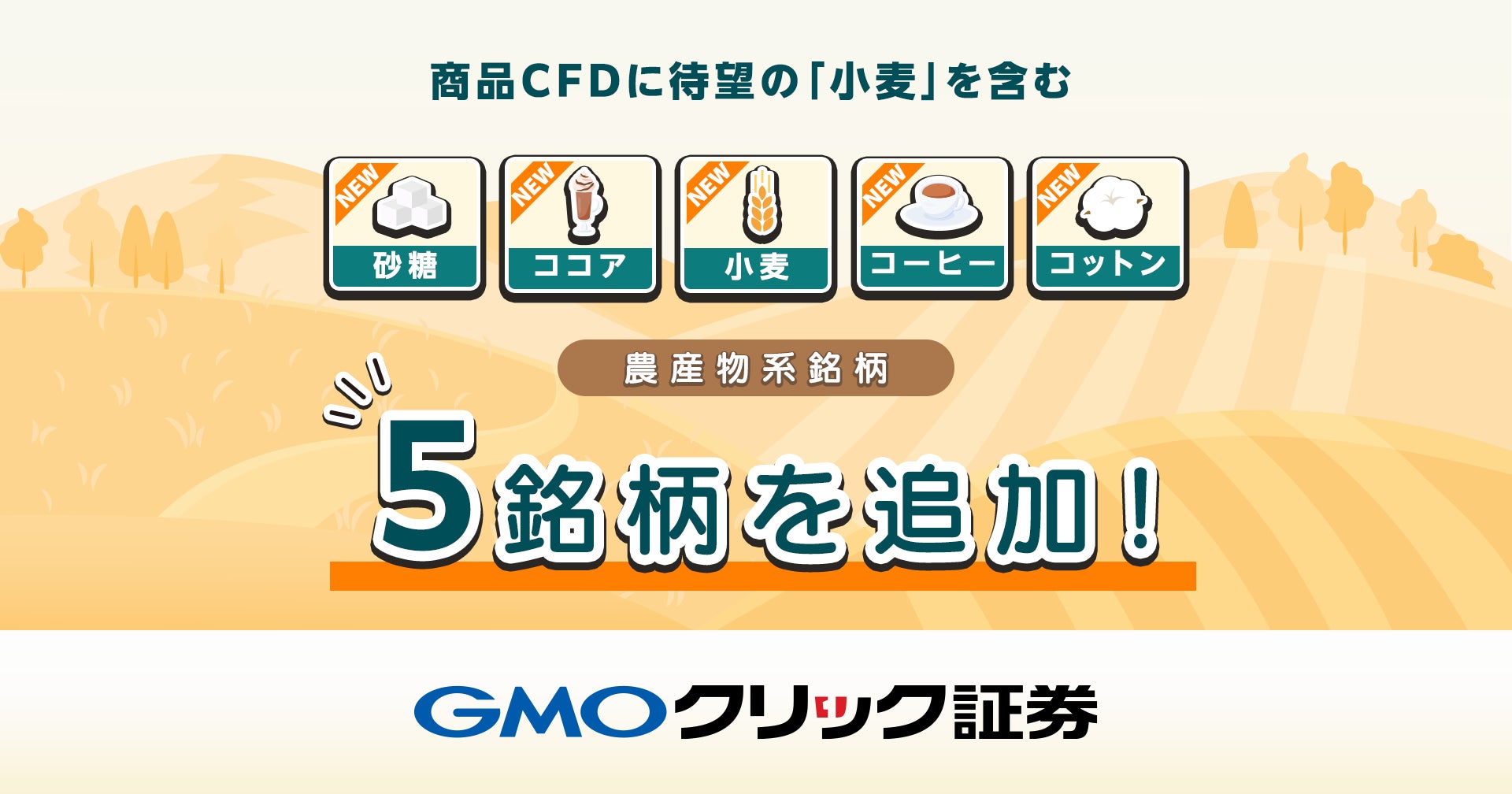 今回の銘柄拡充では、多くのお客様から銘柄追加のご要望をいただいていた「小麦」を含む農産物系コモディティ5銘柄の取り扱いを開始し、商品CFDのラインナップを強化いたします。これにより、当社のCFD取引サービスの取扱銘柄数は151銘柄となります。この機会に、魅力的な銘柄が豊富に揃うCFD取引をぜひお試しください。